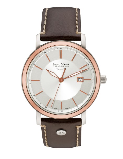 Herrenuhr, Quarzwerk in BS-Ausführung, Edelstahlgehäuse Ø 43 mm, Höhe 7,30 mm, ionenplattiert bicolor rosé, bis 5 bar, Saphirglas innen entspiegelt, Kalbslederband dunkelbraun mit Faltschließe